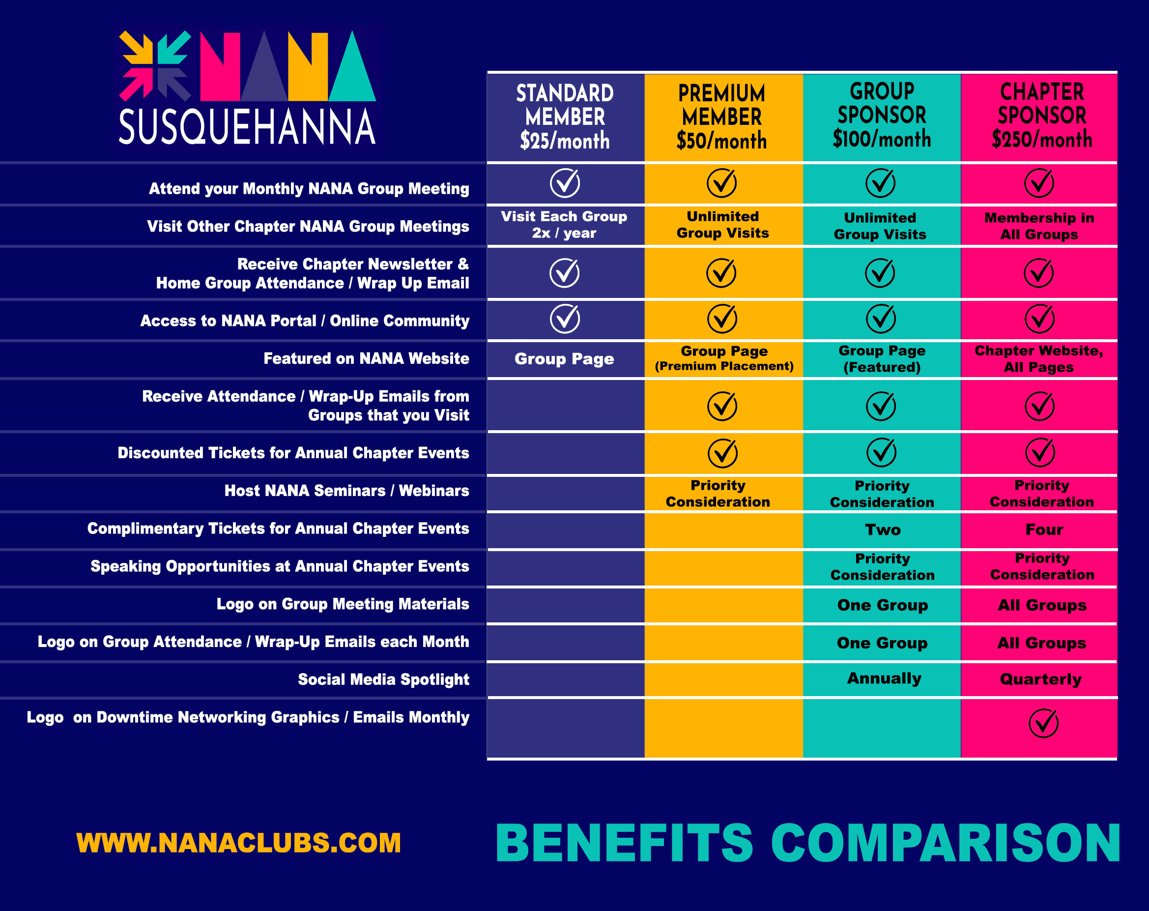 Standard Members may visit all other NANA Club within the Region, up to two times per year. (A Region is a geographical region (e.g. NANA Susquehanna is a Region comprised of Groups based in Harford and Cecil Counties, MD). Premium Members, Club Sponsors and Region Sponsors are allowed unlimited visits to each group.